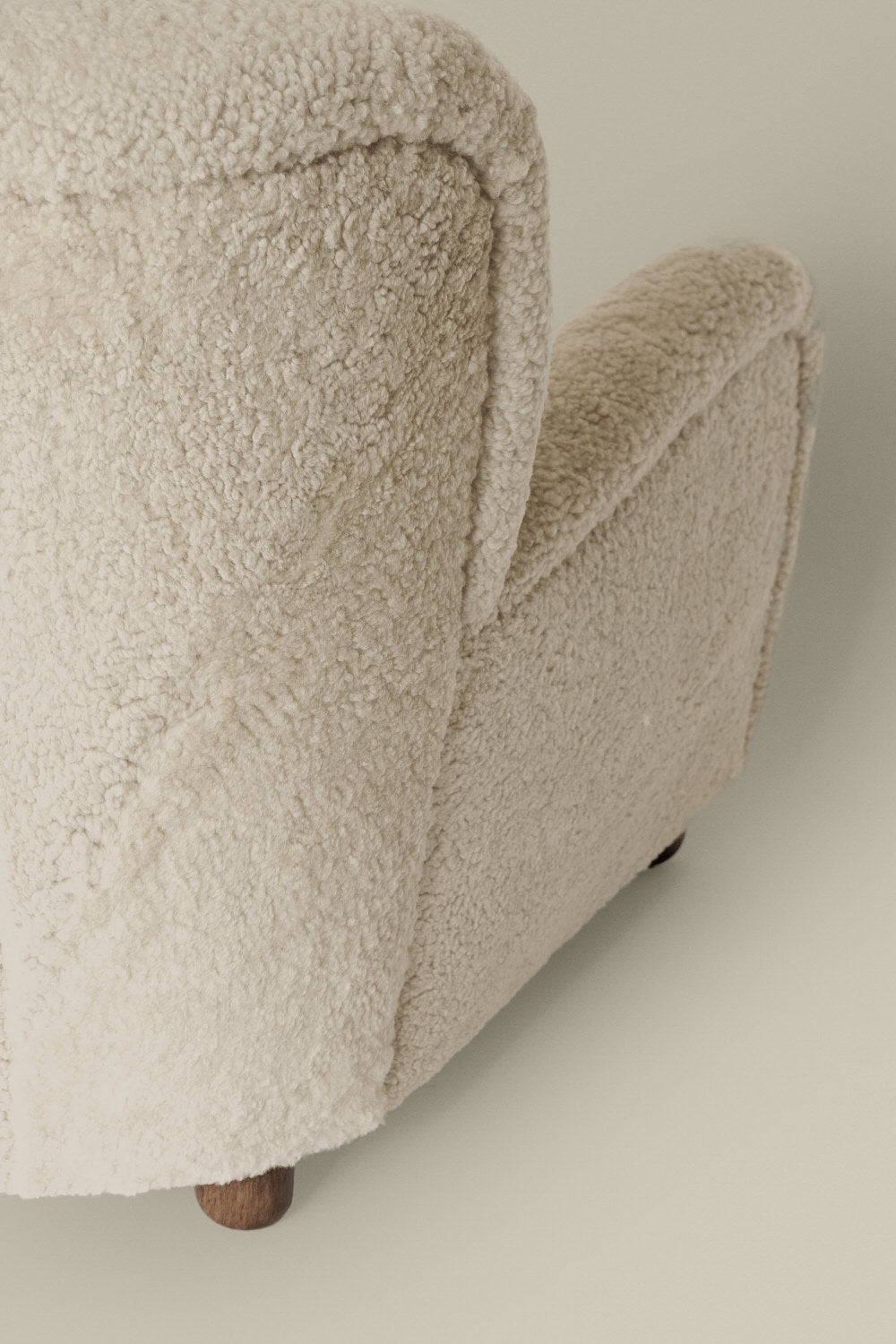 Our shearling chair is made in mind to encourage cozying up with your favorite read and warm drink. It's designed to cradle the body and add an approachable sophistication to your space. Beige shearling upholstery paired with rounded wood oak feet.